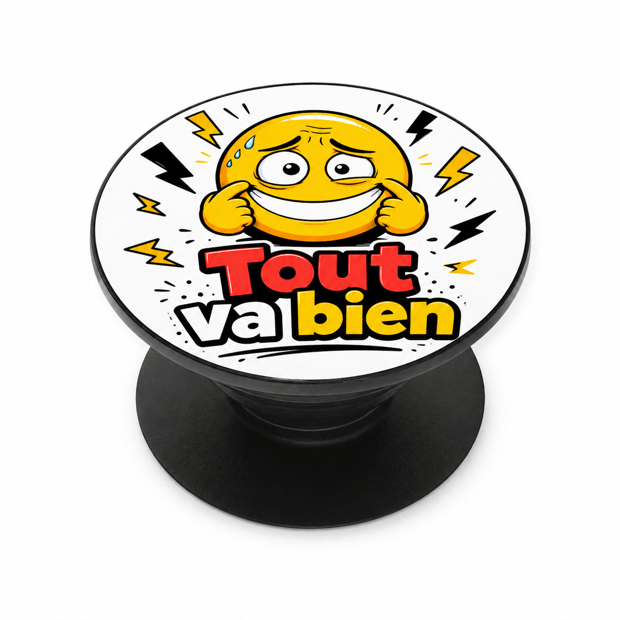Un grip pour coque de téléphone au design cartoon décalé "Tout va bien" avec un emoji jaune qui force son sourire sous une pluie d'éclairs. Le message universel de celui qui gère — ou fait semblant. Terriblement honnête et immédiatement reconnaissable.