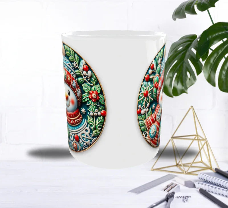 Laisse entrer la magie de Noël dans ton quotidien avec ce superbe mug en sublimation mettant en scène un adorable bonhomme de neige, tout sourire, vêtu d’une écharpe cosy et d’un bonnet d’hiver richement décoré.