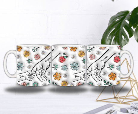 Mug Personnalisé “Main dans la Main” – Texte (Maman/Papa…) & Prénom au Choix – Sublimation Fleurie