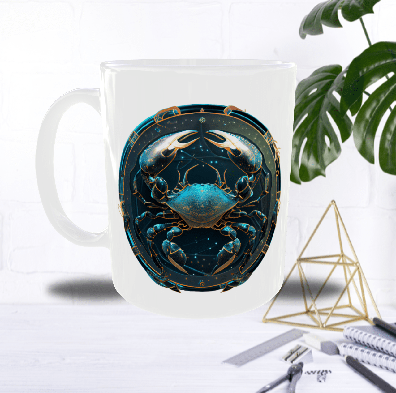 Douceur, intuition et force intérieure : ce mug célèbre le Cancer, signe protecteur et profondément sensible. Son visuel élégant met en scène le crabe céleste, entouré de détails étoilés et de nuances bleu nuit, comme un talisman cosmique qui rappelle l’univers intime et rassurant de ce signe d’Eau.
