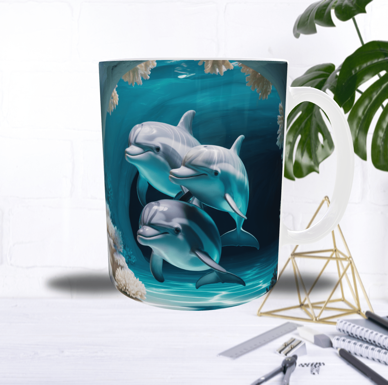 Plonge dans une bulle de calme et d’évasion avec ce mug en sublimation illustrant trois jolis dauphins nageant paisiblement dans les profondeurs de l’océan. La scène, baignée de nuances bleu lagon et turquoise, dévoile un décor marin enchanteur : une grotte sous-marine, des reflets lumineux dans l’eau et de délicats coraux qui encadrent les dauphins comme dans un rêve.