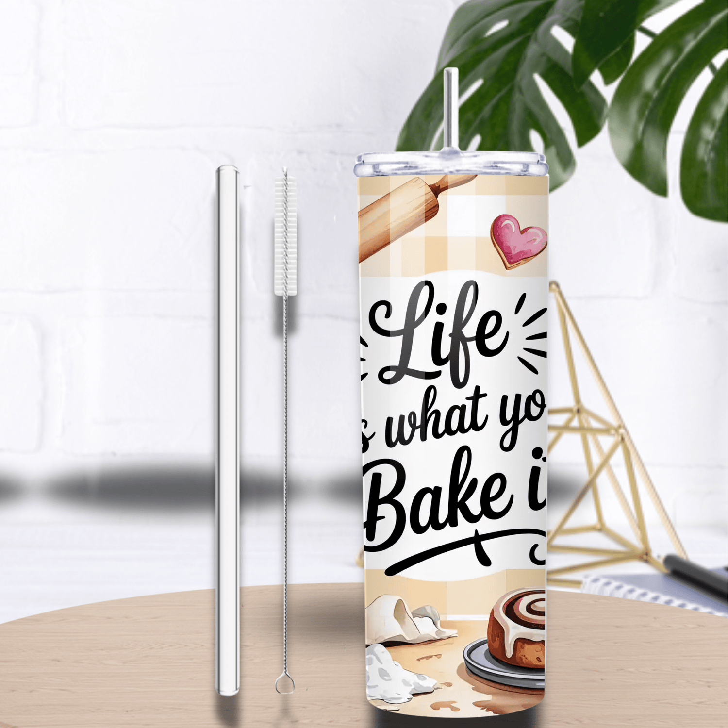 Ajoute une dose de douceur à chaque gorgée avec ce tumbler en sublimation “Life is what you bake it” ! Un design ultra cosy inspiré de la pâtisserie : robot rose, fouet, rouleau à pâtisserie, tablier, petits cœurs et brioches à la cannelle sur un fond vichy… tout ce qu’il faut pour une ambiance cuisine maison et good vibes.