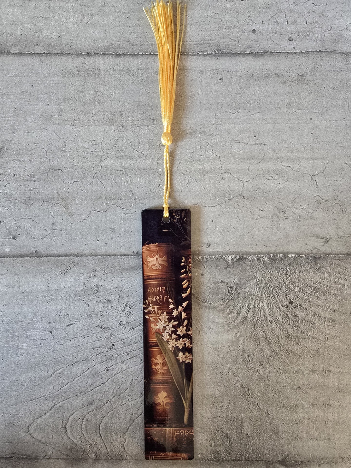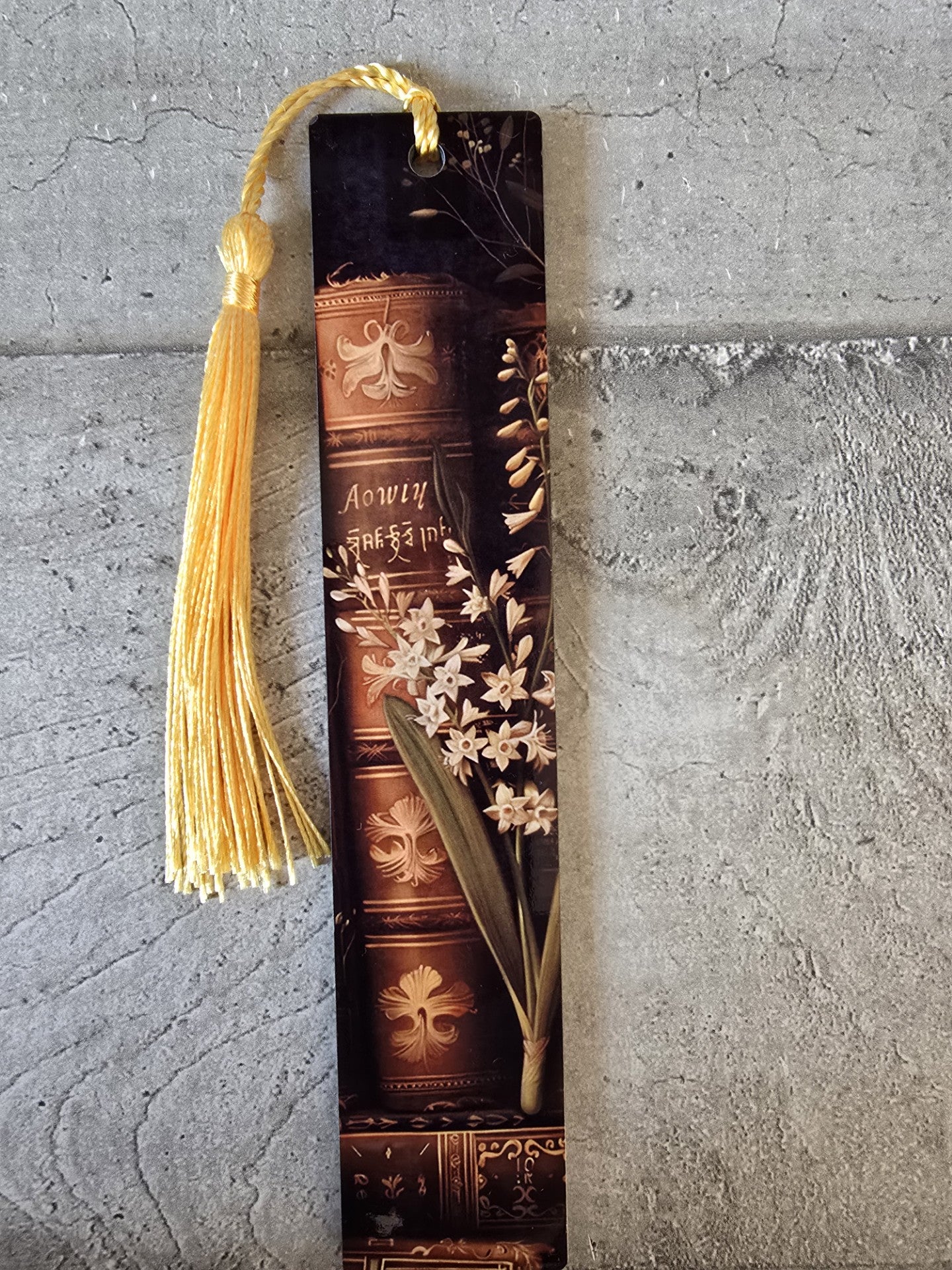 Plonge dans une ambiance bibliothèque vintage avec ce marque-page en fibre de bois imprimé en sublimation : un superbe visuel de livre ancien accompagné d’une fleur délicate, dans des tons chauds et élégants. Son pompon doré te permet de retrouver instantanément ta page et apporte une finition chic.